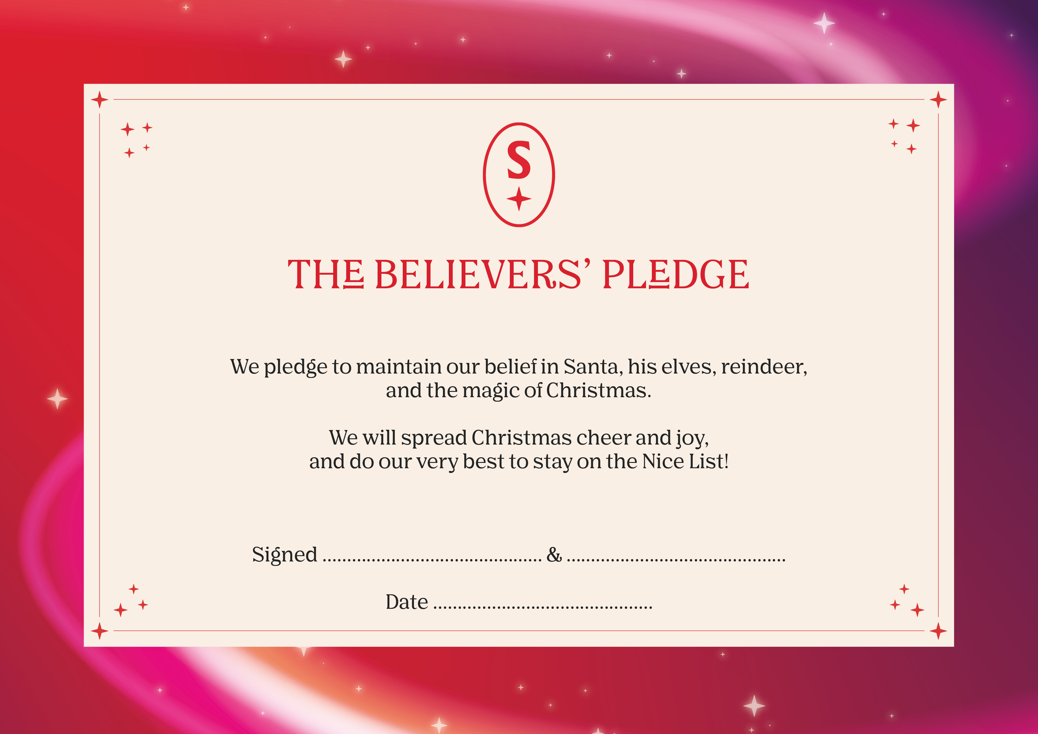 By signing the Believers’ Pledge, you confirm your belief in Santa Claus and the magic of Christmas.